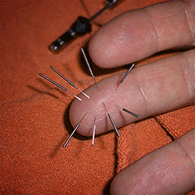 Wir verwenden meistens Akupunkturnadel aus Stahl mit Kupfer, selten Silber-oder Goldakupunkturnadeln. Die Nadeln sind steril verpackt zur einmaligen Verwendung Standardnadel: 0,3 mm dick, 3 cm lang für besondere Akupunkturtechniken werden auch 11 cm lange Nadeln oder nur 0,16 mm dicke Nadeln verwendet. Weiterhin gibt es besonders kurze Dauernadeln zum mehrtägigen Verbleib und sogar winzige Ohrimplantate.