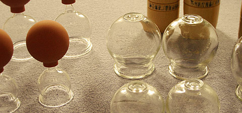 Schröpfköpfe aus Glas werden mit Unterdruck auf Akupunkturpunkte und bestimmte Hautregionen gesetzt oder entlang einer Leitbahn gezogen. So kommt der Qi-Fluss in Gang, Kälte- und Windeinflüsse werden aus dieser Region abgeleitet.